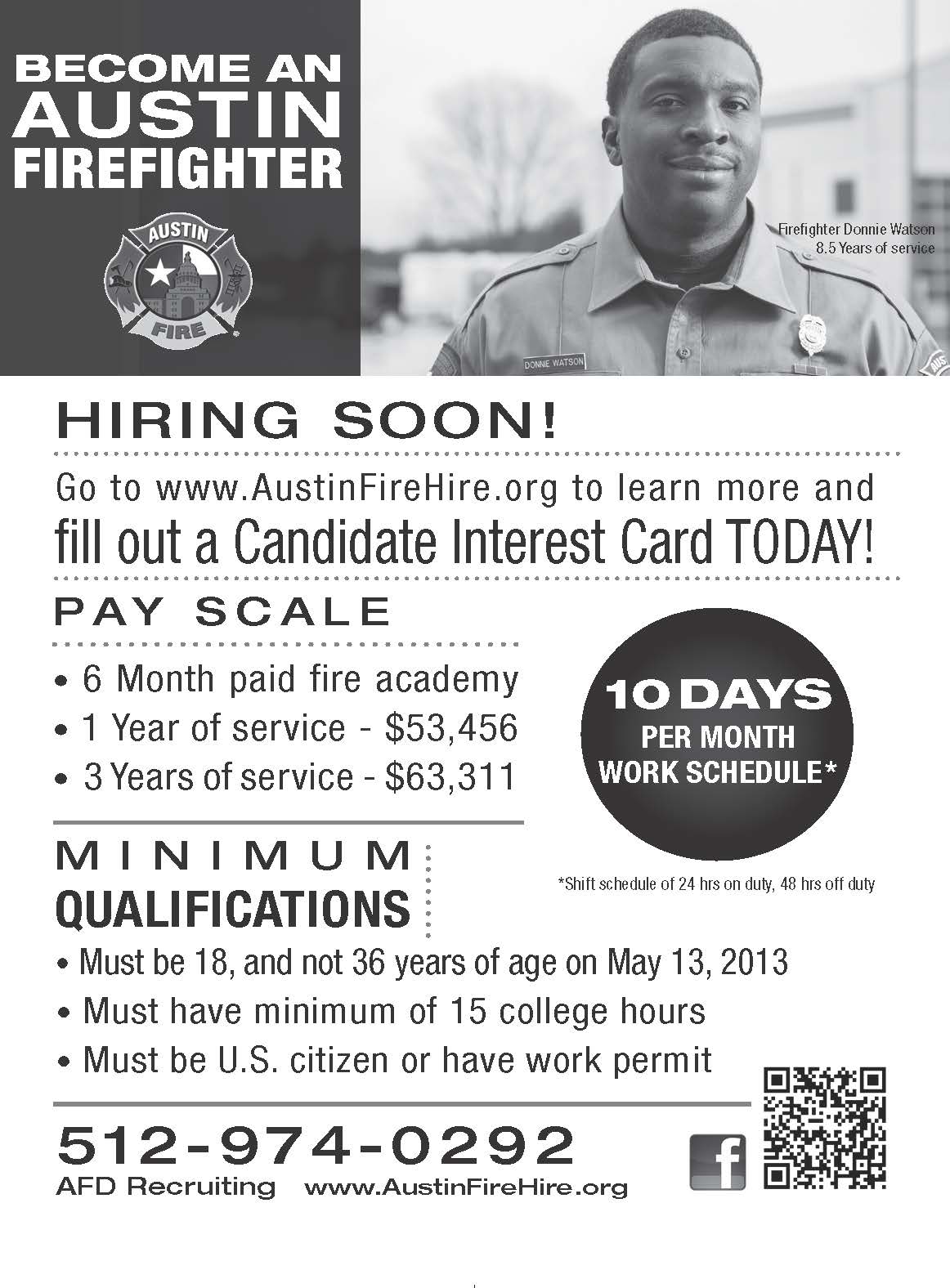 How you thought about saving lives? Have you thought about wearing a uniform that make you proud? Have you thought about being a positive career model to your community? A firefighter can be all that and more. Please read the above information and if you have specific questions that you want to discuss, give them a call because someone will be available to help you. Join the Austin Fire Department today. Take the first step and complete the recruiting process! Go for it!