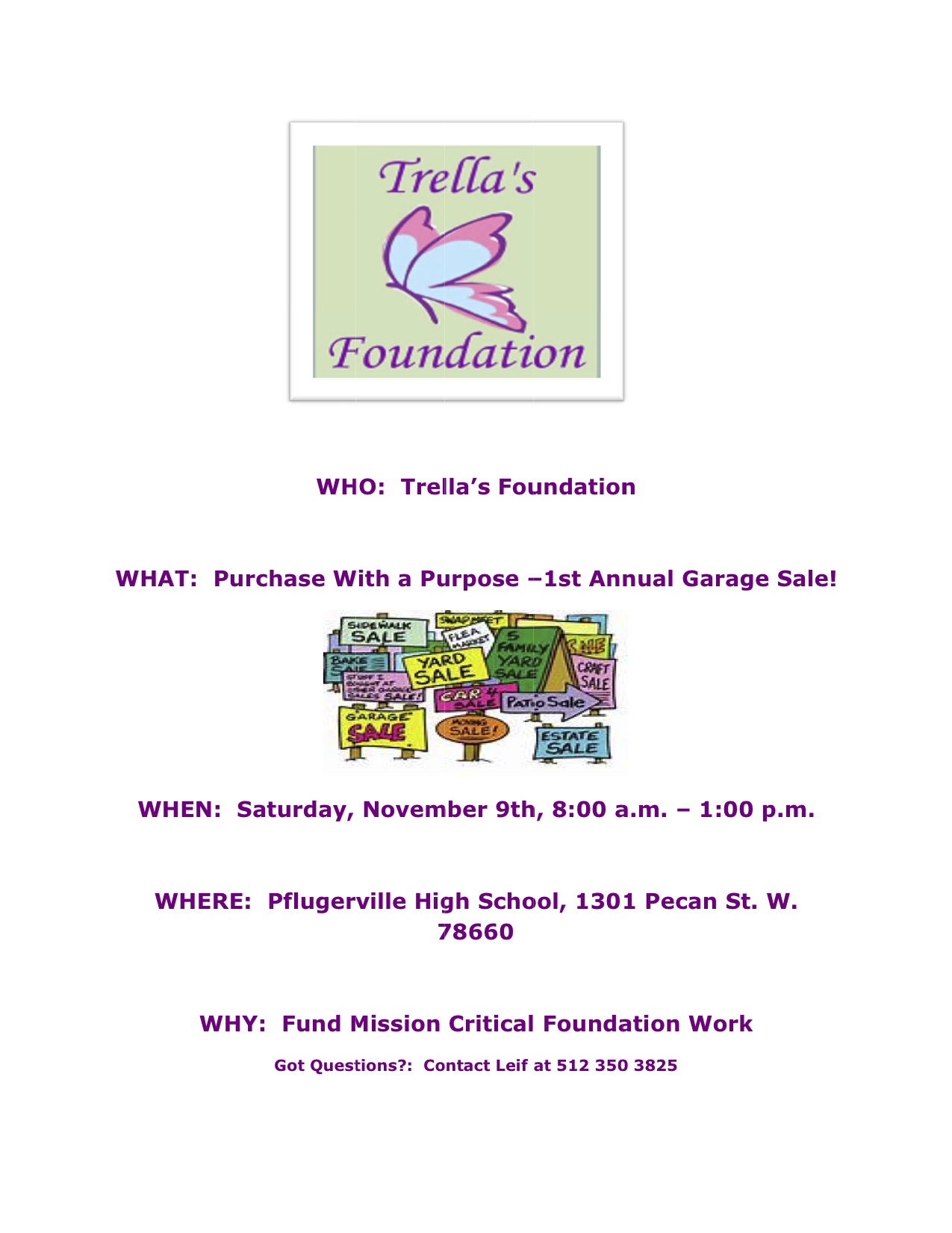 UncategorizedTrella Foundation 1st Annual Garage Sale Come and join us on Saturday. Good Stuff for a Good Cause! We Appreciate Your Support! Share this: Click to share on X (Opens in new window) X Click to share on Facebook (Opens in new window) Facebook More Click to share on Pinterest (Opens in new window) Pinterest Like Loading... Related