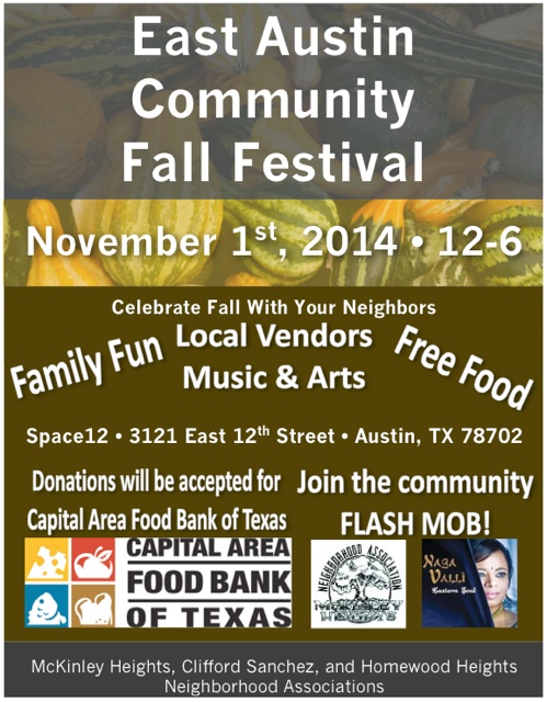 Its a fact that central austin is rapidly growing. Get a chance to meet your new neighbors at The East Austin Community Fall Festival supported by the McKinley Heights, Clifford Sanchez and Homewood Heights Neighborhood Association, on Saturday, November 1, 2014, 12:00p – 5:00p at Space12 located at 3121 E 12th St Austin, Tx 78702.