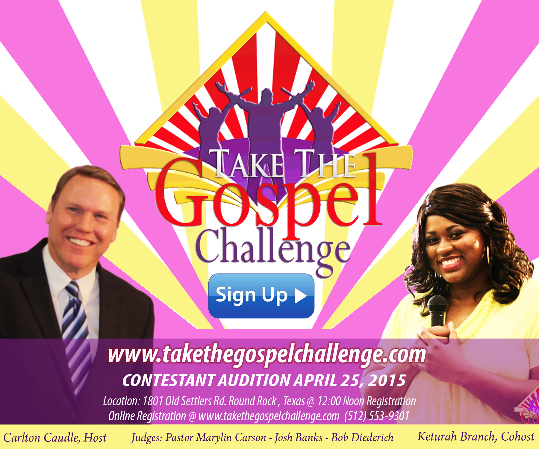 The auditions will take place on Saturday, April 25th at 1801 Old Settler’s Blvd which is the Williamson County Jester Annex. We are asking people to arrive at 12 noon. Please visit http://www.takethegospelchallenge.com for more information. Contestants can register at the website as well.