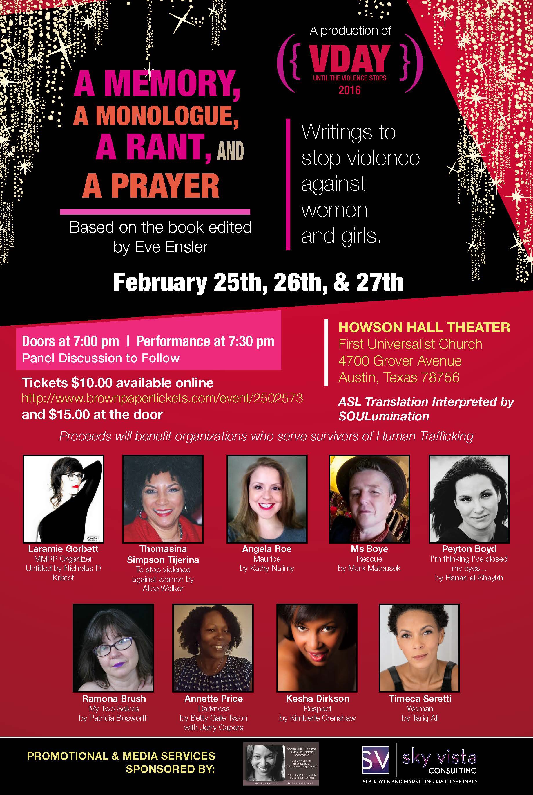 3 NIGHTS ONLY A Memory, A Monologue, A Rant and A Prayer presented at Howson Hall Theatre located at First Unitarian Universalist Church, 4700 Grover Avenue, Austin, TX 78756. All performances will benefit survivors of human trafficking at Allies Against Slavery. Ticket prices are $10 and SOULilumination will provide ASL services.