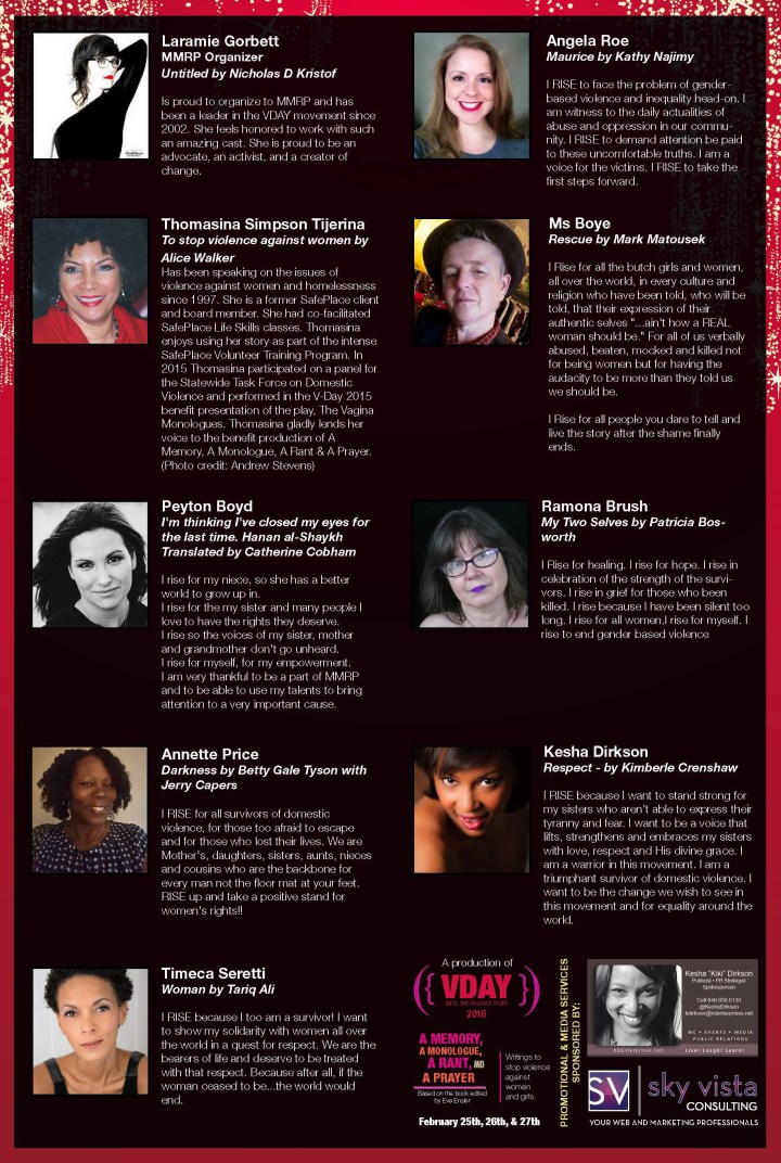 On February 25, 2016– Eve Ensler’s a MEMORY, A MONOLOGUE, A RANT & A PRAYER, hosted by First Unitarian Universalist Church, is a groundbreaking collection of monologues by world-renowned authors and playwrights, edited by Eve Ensler and Mollie Doyle. MMRP Organizer, Laramie Gorbett says,” this year’s dynamic cast embraces the powerful words of these writings, and their voices rise up to stop the violence against women and girls around the world.” These diverse voices ignite a collective roar to break open, expose, and examine the insidiousness of violence at all levels: brutality, neglect, and a punch, even a put-down. This play will simultaneously break your heart and inspire you to be part of the solution to end gender-based violence.