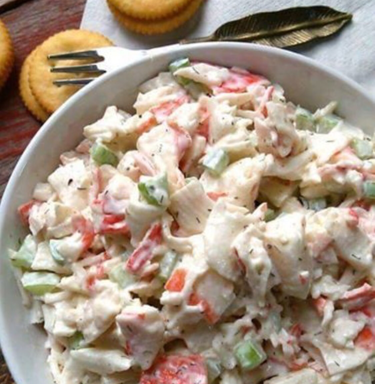 Separate crab into individual pieces (only if compressed in package – if not, disregard) and chop into 1/2-inch pieces; add to a medium bowl. Add remaining ingredients and gently stir until well combined. Serve immediately or cover and refrigerate to store.