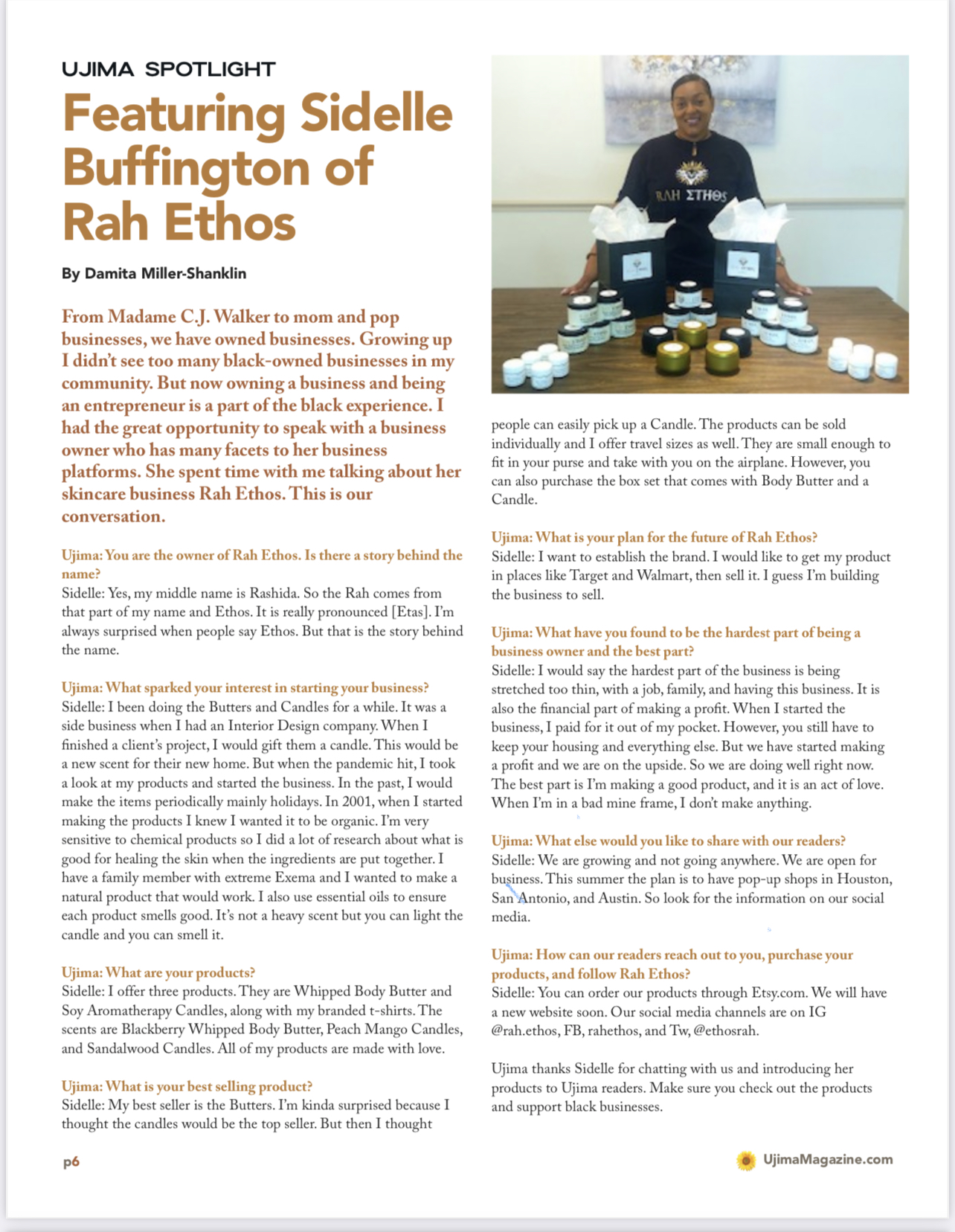 Business, Community, Latest IssueUjima Feature Story: Sidelle Buffington, Owner of Rah Ethos Share this: Click to share on X (Opens in new window) X Click to share on Facebook (Opens in new window) Facebook More Click to share on Pinterest (Opens in new window) Pinterest Like Loading... Related