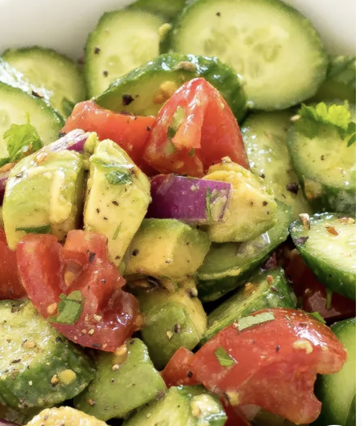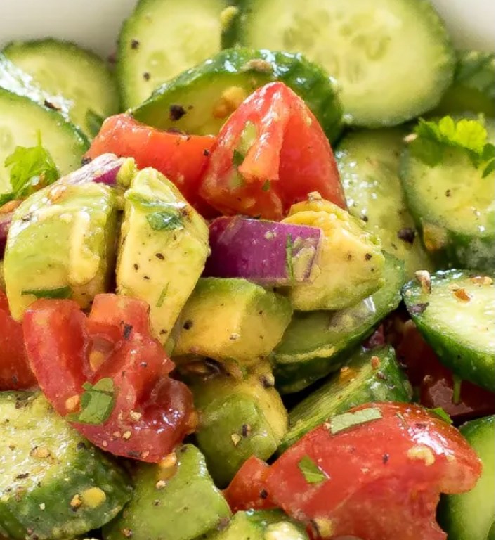 To make this simple and refreshing Cucumber Avocado Salad, just add all of the ingredients in a medium-sized bowl, and toss to combine. Season with salt and freshly cracked black pepper to taste. That’s it!