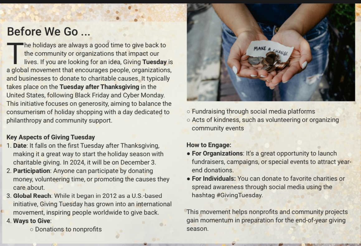 This is the time of year we like to give back to our communities and the people who may need some extra help. This particular story focused on Giving Tuesday, however, giving can be done at anytime you see fit. This just provides you with some information that may provide you some guidance.