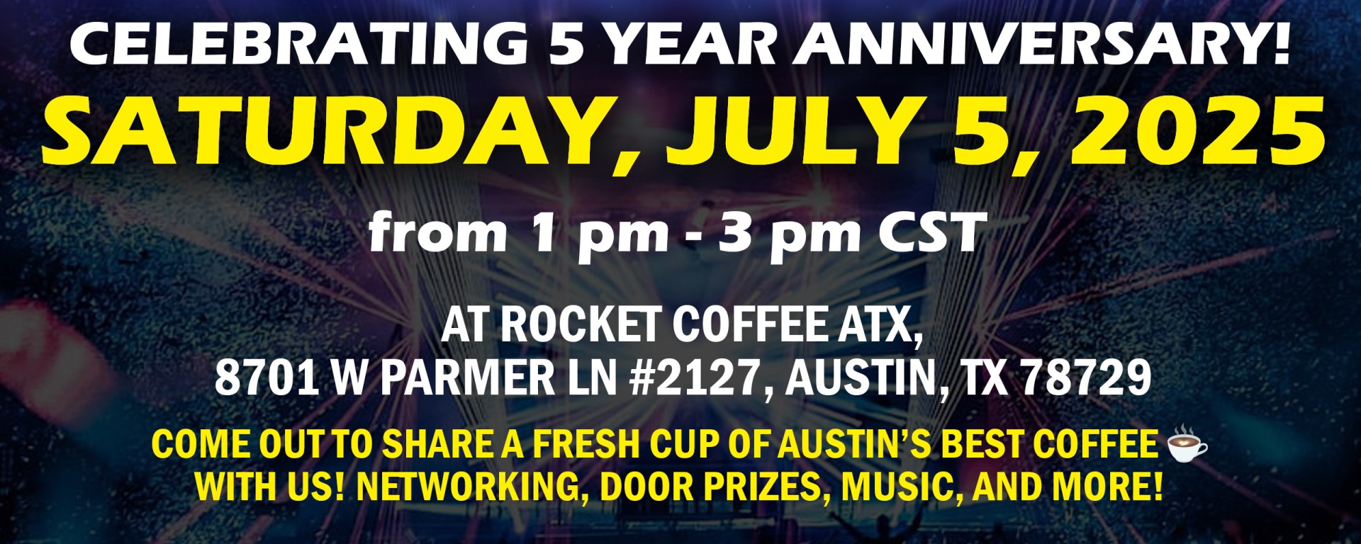 Yes, we are celebrating our 5-year podcast show anniversary, ‘Bring it In the House’, this Saturday, July 5th at Rocket Coffee ATX, 8701 W. Parmer Lane, #2127, Austin, TX 78729 from 1 pm – 3 pm. The first coffee beverage is on me! See you there!