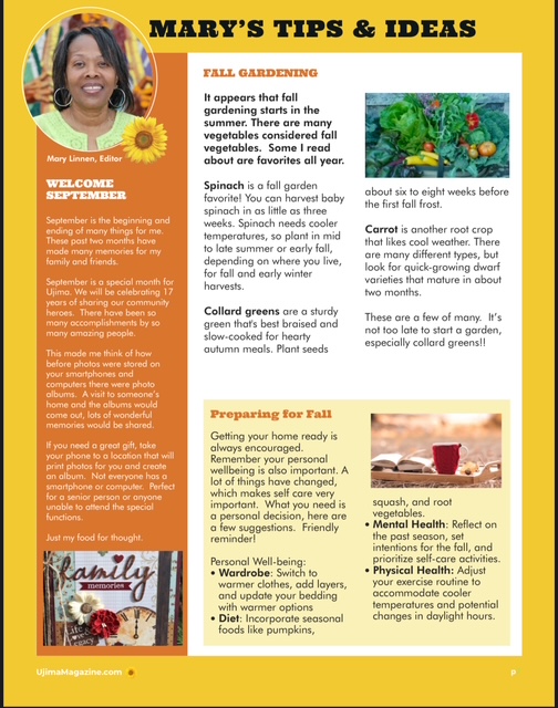 We hope you love Mary’s Tips and Ideas as much as she enjoys sharing them with you each month. What tips or ideas have you taken from her page? She would love to hear from you. These snippets of information is to provide you with some quick motivation and ideas that may help make your life or day a little easier.